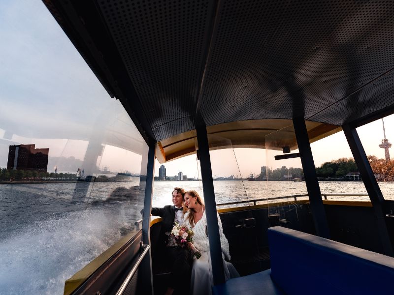Foto-idee: Een intieme, romantische wandeling langs de Maas bij zonsondergang, een funride met de watertaxi naar de Kop van Zuid. Afsluiten met een sunsetshoot bij een van de iconische Rotterdamse bruggen.